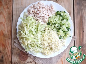 Белки отделить от желтков. Куриную грудку, огурец и капусту мелко нарезать. Желтки натереть на терке.
