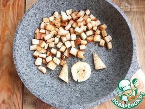 Для сухариков на разогретую сковороду вливаем масло и нарезанный небольшими кубиками хлеб (2 ломтика). Обжариваем хлеб до румяной корочки, постоянно помешивая.