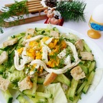 Рецепт этого простого салата у меня уже давно. Попал он в мои руки под названием "Греческий", почему его так называли не знаю. Салат простой, нежный, вкусный и сытный! Предлагаю оформить его в виде символа наступающего года!