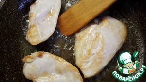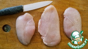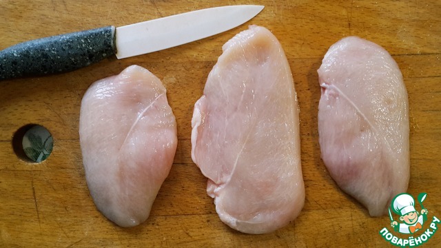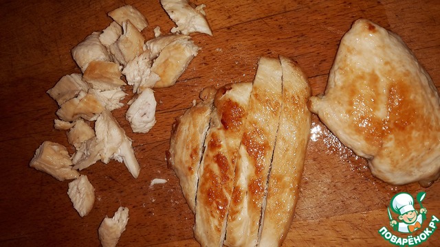 Курицу порезать ломтями для обжарки, чуть посолить.