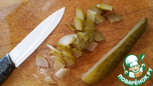 Пока обжаривается можно мелко порезать огурчик, некрупный, среднего мне хватило даже 2/3.