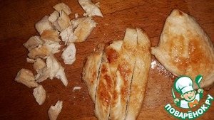 Обжареную курицу порезать на некрупные кусочки и присоединить к общей массе.