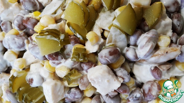 Соединить в миске фасоль и кукурузу (без жидкости), добавляем к ним огурчик и измельченный зубчик чеснока.