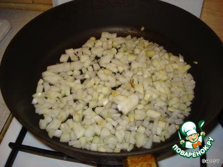 Пока рыба в духовке, готовим гарнир. Мелко режем лук.