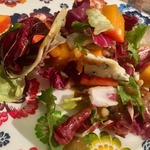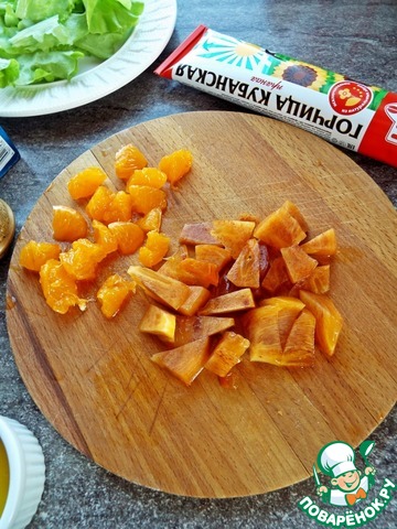 На тарелку нарвать салат, выложить мандарин и хурму.