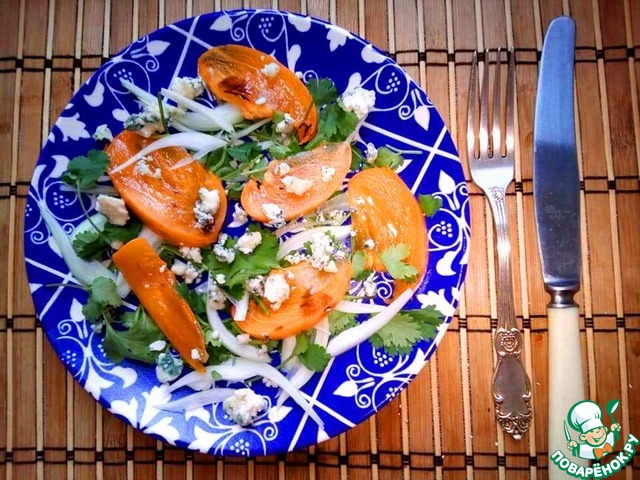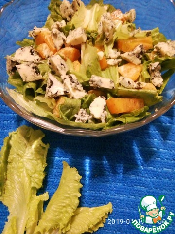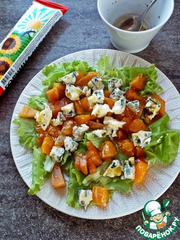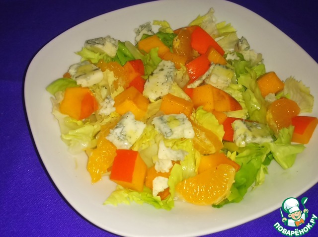 Салат с хурмой, мандаринами и сыром с плесенью. Я очень люблю кулинарные нестандартные идеи. Сочетание соленого и сладкого в салате - уважаю. И когда я увидела этот рецепт, загорелось мне воплотить его на своей кухне. Салат получился ооочень интересным на вкус. Конечно, такой салат не готовится тазами. Подавать такую закуску надо понимающим гурманам. Мы с мужем с удовольствием попробовали и съели этот салат и приняли решение готовить его еще. В преддверии новогодних праздников, советую присмотреться к этому салату. Готовится салат молниеносно. Угостите своих домашних или гостей, рекомендую.