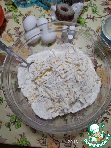 Муку просеять, добавить ванилин и разрыхлитель. Масло натереть на терке, перемять в крошку с сухими ингредиентами