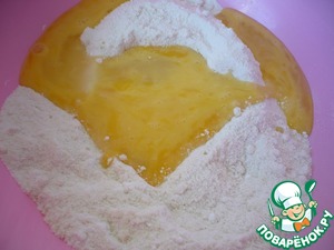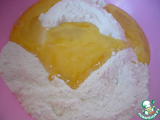 В мучную смесь влейте яичную массу. Все хорошо перемешать.