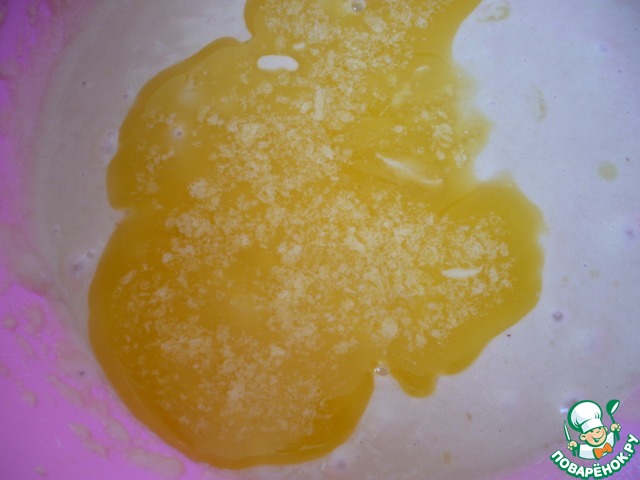 Когда масса станет однородной, влейте аккуратно слегка остывшее сливочное масло. Получится гладкое тесто.