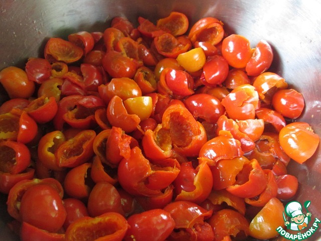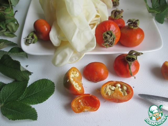 Шиповник чистим (в перчатках), разрезая плод пополам и вычищая семена и волоски. Из 1кг останется 500 г плодов.