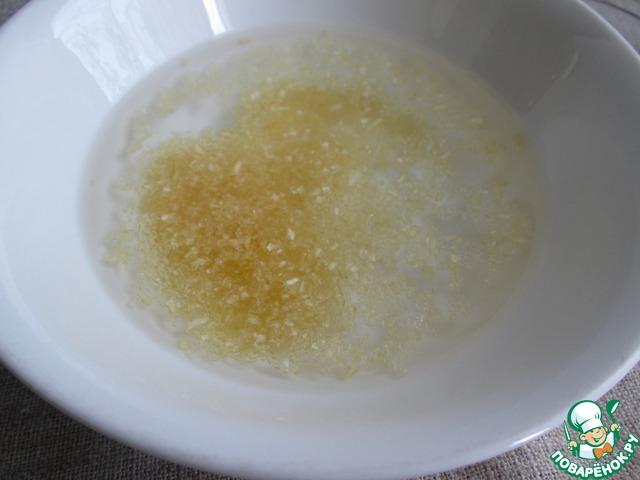 В это время займёмся желатином. Заливаем его холодной кипячёной водой и оставляем набухать 25-30 минут.
