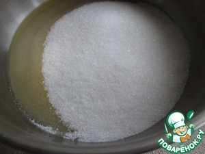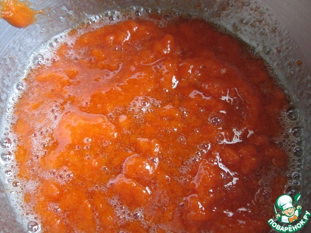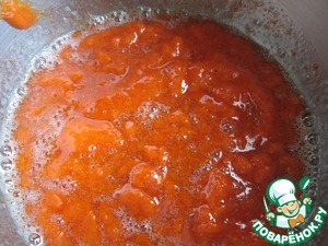 Пока пюре немного остывает, в сотейнике смешиваем сахар и 4 ст. л. апельсинового сока.
