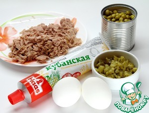 Все предельно просто. Сливаем сок из банки с тунцом. На мелкие кубики нарезаем тунец, сваренные яйца и соленый огурец. Добавляем две ложки зеленого горошка.