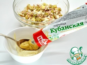 Для приготовления заправки я использую горчицу Кубанскую ТМ HAAS. Она приготовлена из натуральных зерен, имеет ярко выраженный аромат и нежную консистенцию. Смешиваем майонез и горчицу в соотношении 2 к 1, тщательно перемешиваем и добавляем к нарезанным продуктам.
