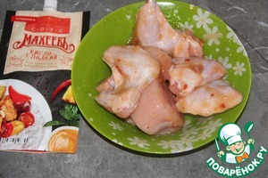 Порционные куски курицы слегка посолить и залить кисло-сладким соусом от Махеев. У меня, исходя из вкусов семьи, 4 крылышка и 3 кусочка с грудки. Можно брать только крылья, только грудку, окорочка и тд. На это количество курицы у меня ушло половина пачки соуса, это примерно 120 гр.