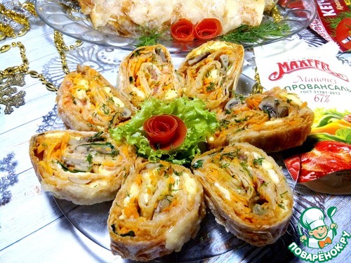 Согласитесь, что в любой праздник или будние дни, всегда выручает закуска из лаваша. Завернуть в лаваш можно все, что угодно, получится беспроигрышный вариант. А чтобы начинка получилась нежной и сочной -в помощь - разнообразная, замечательная продукция ТМ "МахеевЪ". Хочу предложить вам этот вариант горячей закуски, уверяю, это очень вкусно. Лаваш сверху слегка хрустящий, а внутри сочная начинка. Грибы можно взять любые и жареные, и маринованные, все на свой вкус и фантазию.
