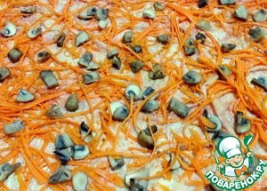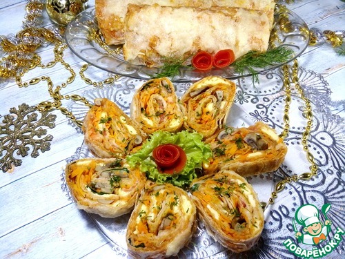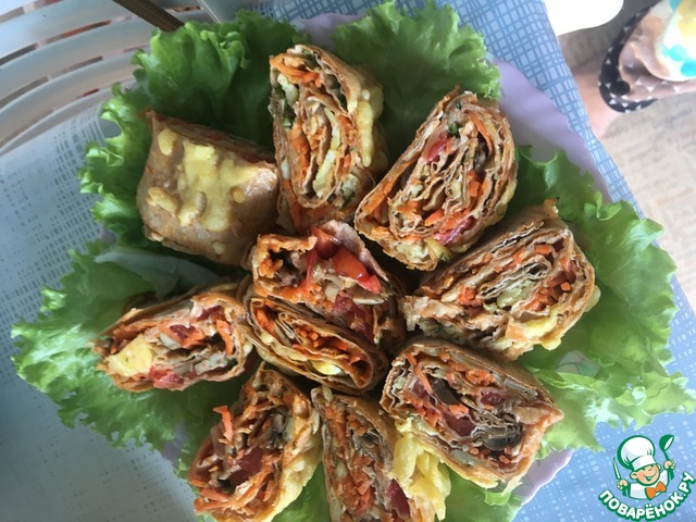 Накрываем третьим лавашом, намазываем оставшейся намазкой, раскладываем морковь по-корейски и жареные грибы.