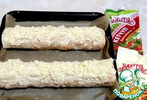 Сворачиваем в тугой рулет, обрезать с двух сторон края. В объеме получился толщиной 26см. Я разрезала пополам (как помните он 65см)и уложила на противень застеленный пекарской бумагой. Бумага у меня уже смазанная, готовая для выпечки. Вы же, смотрите по качеству своей. Сверху рулеты смазать майонезом Провансаль ТМ "МахеевЪ" и разложить вторую половину сыра.