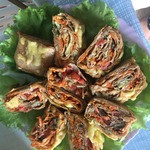Сыр натереть на средней терке. Морковь приготовить по-корейски или купить готовую. Грибы обжарить в 1 ст. л. масла, помидоры нарезать полукольцами. Яйца хорошо размешать венчиком, не солить, соли достаточно в моркови и сыре. Нагреть сковороду с 1 ст. л. растительного масла и вылить в нее яичную болтушку, огонь ниже среднего, как немного схватится, сдвинуть со всех сторон к центру и продолжать так далее. Не пересушить и не мешать, только сдвигать лопаточкой, чтоб были крупные и сочные кусочки. В этом начинка только выиграет.