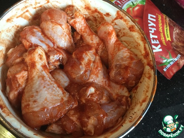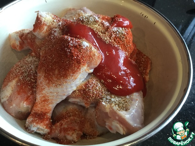 Крылья разрежьте по суставу. Положите в миску крылышки и голени, добавьте специи и кетчуп МахеевЪ Шашлычный, посолите.
