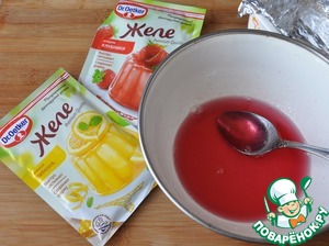 Заранее готовим желе. Берём любого вкуса, у меня лимонное и клубничное от Dr. Oetker. Воду кипятим и заливаем порошок желе из расчёта 100 мл на пачку. Это в два раза меньше, чем указано в инструкции, нам нужно более плотное желе. Размешиваем раствор с желе до полного растворения, даём остыть и ставим в холодильник для полного застывания.