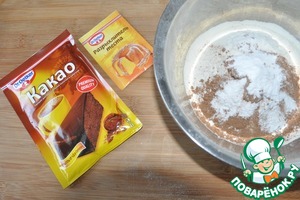 Берём миску, смешиваем просеянную муку, соль, разрыхлитель (Dr. Oetker), и какао-порошок (Dr. Oetker).