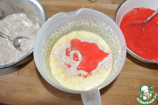 К взбитым маслу с сахаром и яйцами по частям добавляем сухие ингредиенты и кефир с красителем и продолжаем взбивать.