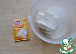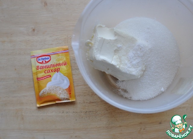 Готовим крем. Берём творожный сыр (рекомендую достать из холодильника за 30 минут), добавляем сахар и ванильный сахар (Dr. Oetker). Взбиваем в крем.