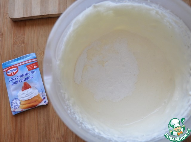 Для того, чтобы крем держал форму добавляем загуститель для сливок (Dr. Oetker). Взбиваем крем до устойчивых пиков.