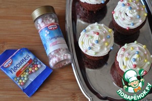 С помощью кондитерского шприца отсаживаем крем на капкейки, для украшения посыпаем кондитерскими посыпками (Dr. Oetker).