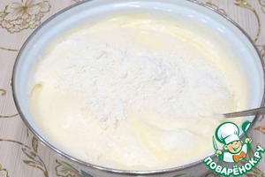 Желтки взбить с оставшейся частью сахара до бела, затем добавить крахмал (60 гр.), добавить разрыхлитель (1/2 ч. ложки). Смесь еще раз взбить.