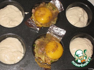 Аккуратно сверху разбить по яйцу, посолить, поперчить.