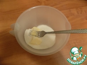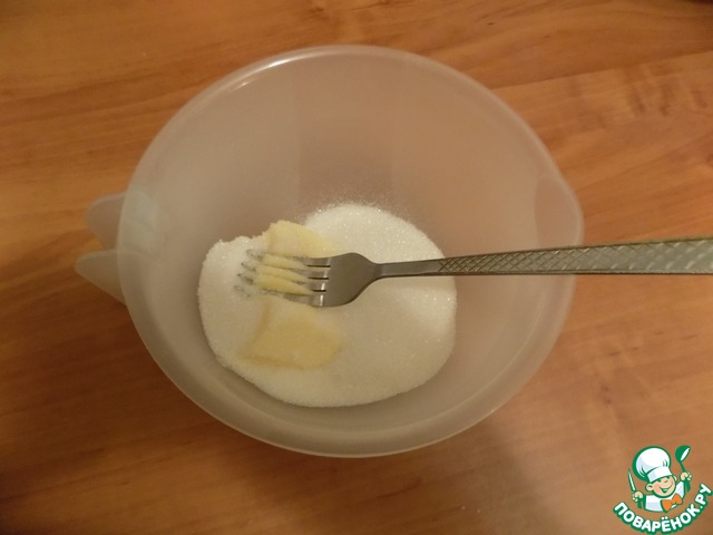 Масло нужно взять мягкое. Его нужно заранее вынуть из холодильника. Тщательно растираем масло с сахаром.