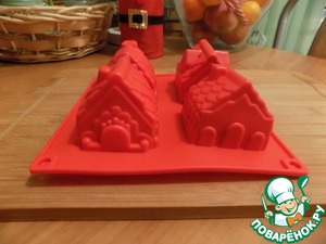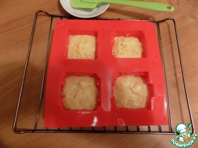 Я купила очаровательные новогодние формочки для кексов в виде домиков 4 шт и все разные. Впервые их использовала. Намочила силиконовую форму и выложила тесто силиконовой лопаткой на 2/3 высоты формы. Греем духовку до т-180 С и ставим в неё кексы минут на 15. Ориентируйтесь по своей духовке.