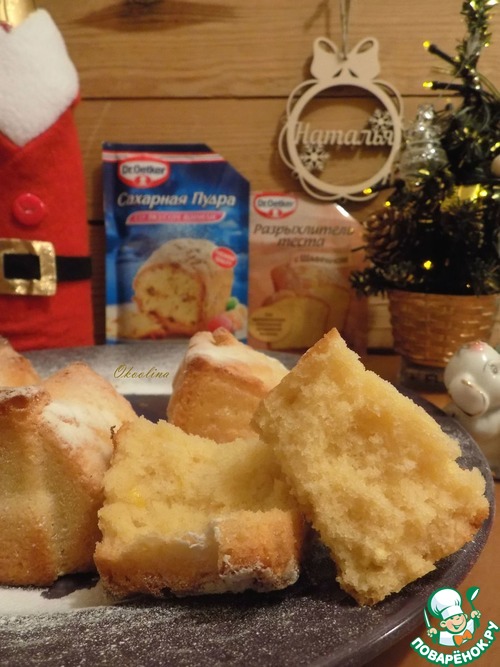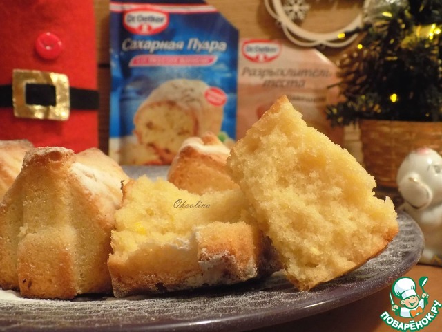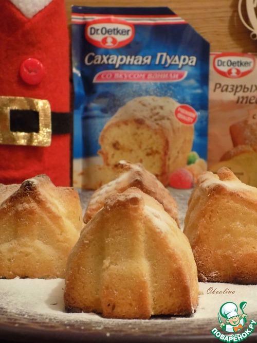 Кексы вынулись легко. Я их поместила на блюдо. Домики не очень устойчиво стояли и низ я подравняла ножом. Дала кексам остыть и присыпала их сахарной пудрой Dr. Oetker" с ванилью.