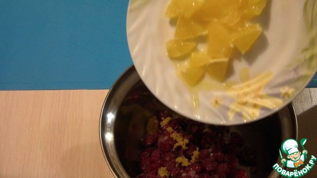 Готовим начинку. Хорошо промываем апельсин, натираем цедру. Затем разрезаем пополам, из одной половины выжимаем сок (для того, чтобы развести им крахмал), а другую нарезаем на мелкий кубик (убрав хорошо белые прожилки).
