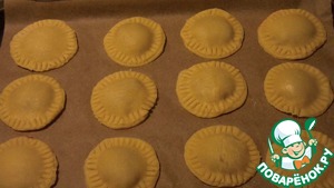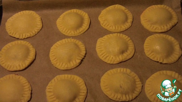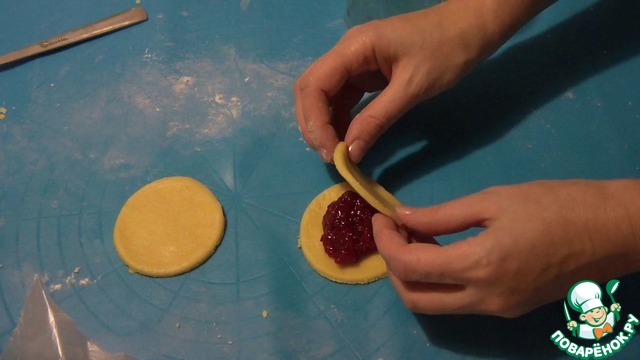 Когда всё остыло, тесто готово. Формируем печенье. Раскатываем тесто в пласт, шириной 2-3 мм, вырезаем кружочки ( я пользовалась бокалом). На одну печеньку- два круга. На один укладываем начинку, вторым накрываем.