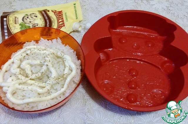 Салат буду укладывать вот в такую форму-снеговик, смазать ее маслом. В рис добавить майонез с оливковым маслом ТМ "МахеевЪ", перец белый свежемолотый, перемешать.