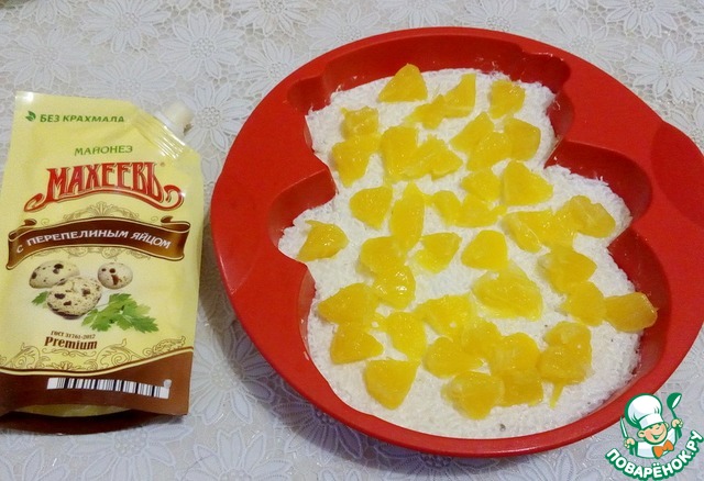 Первым слоем будет рис, выложить его, разровнять и придавить ложкой. На рис выложить кусочки апельсина, без сока.