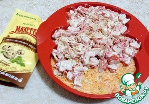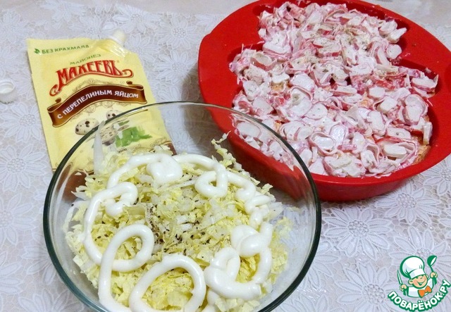 Капусту хорошо отжать от сока, так же добавить майонез с оливковым маслом ТМ " МахеевЪ", перец свежемолотый душистый, перемешать и выложить поверх крабовых палочек, все прижать ложкой, для плотности. Если пользоваться не формой, то нужно укладывать салат в обратном порядке, чтоб рис был сверху.