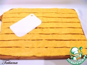 Раскатайте тесто в пласт ~ 25*35 см. (мне скалка не понадобилась, тесто настолько воздушно-"послушное", что с лёгкостью распределилось на разделочной доске). Разрежьте тесто на полосы (8-10 шт.), шириной 2,5-3 см. -