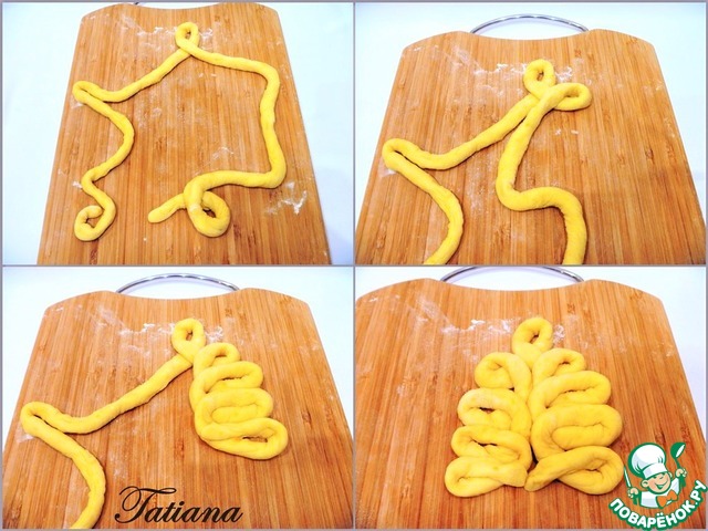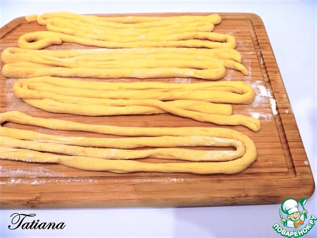 Полосы присыпьте слегка мукой, сформируйте длинные (1,2-1,5 м.)и тонкие (1 см.)жгуты.