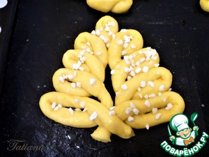 На противень (на антипргарный коврик)переместите при помощи лопатки булочки -"ёлочки".