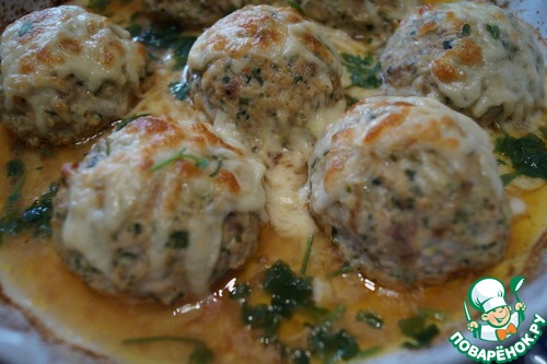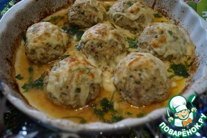 Запекать биточки в духовом шкафу при температуре 180 градусов 30 - 35 мин. За 5 минут до конца запекания посыпать биточки натертым сыром. Подавать посыпав зеленью.