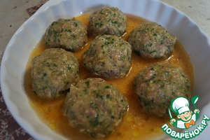 Биточки уложить в форму для запекания и залить бульоном в котором развести чайную ложку томатной пасты.