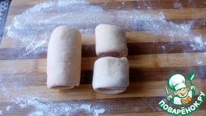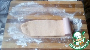 Кусочек теста раскатайте (ширина соответствует размеру половины сосиски, длина - примерно 20 см).