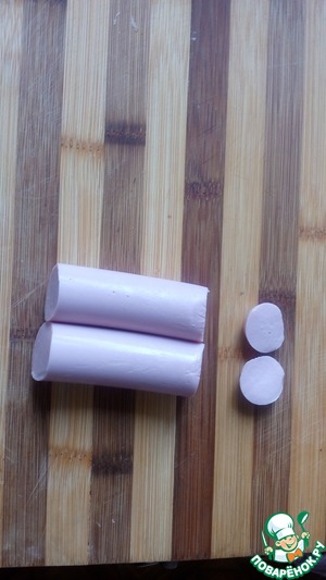 Сосиски очистите от оболочек. Каждую сосиску разрежьте поперёк пополам и срежьте края, которые нам понадобятся в дальнейшем.