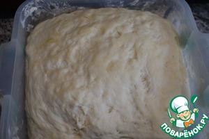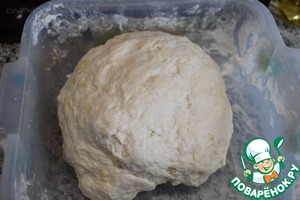 1 кг муки просеять. Влить приятно теплую воду с растворенными дрожжами и солью. Я добавила 1 ч. ложку сахарного песку. Замесить тесто, сильно его не вымешивая. Скатать тесто в шар, накрыть полотенцем и оставить в теплом месте на 30 минут..