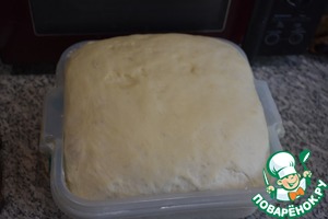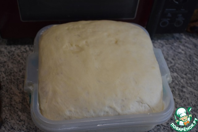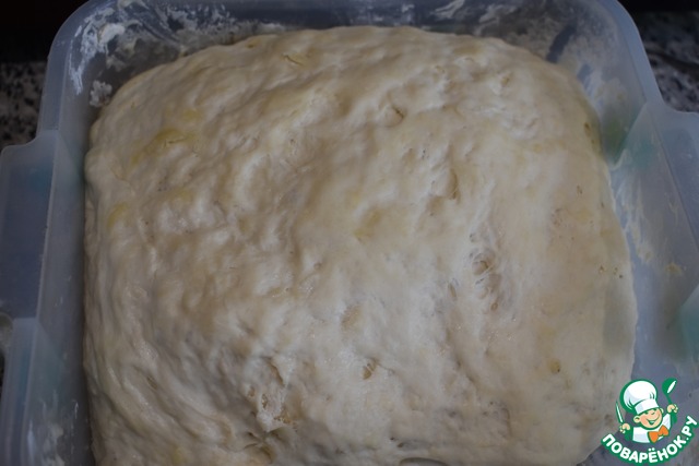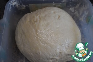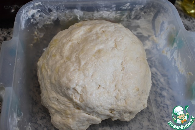 Вот так прилично через 30 минут увеличилось тесто. Тесто тщательно вымесить, можно припылить мукой, мне мука не пригодилась.
