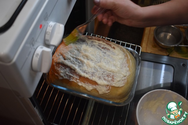Равномерно смазать мучной смесью плотную корочку. Температуру уменьшить до 200 гр., духовку плотно закрыть и выпекать хлеб еще 20 минут. Я пекла 25 минут.